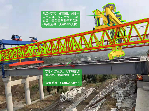 双梁式架桥机的前后端都可吊梁及落梁;改变架梁方向时,不需要调头;为适应曲线架梁,前后臂都可在水平面内摆动;分片架设时不用移梁或拨道,梁就可以就位;“喂梁”也不需要桥头岔线或运梁车。